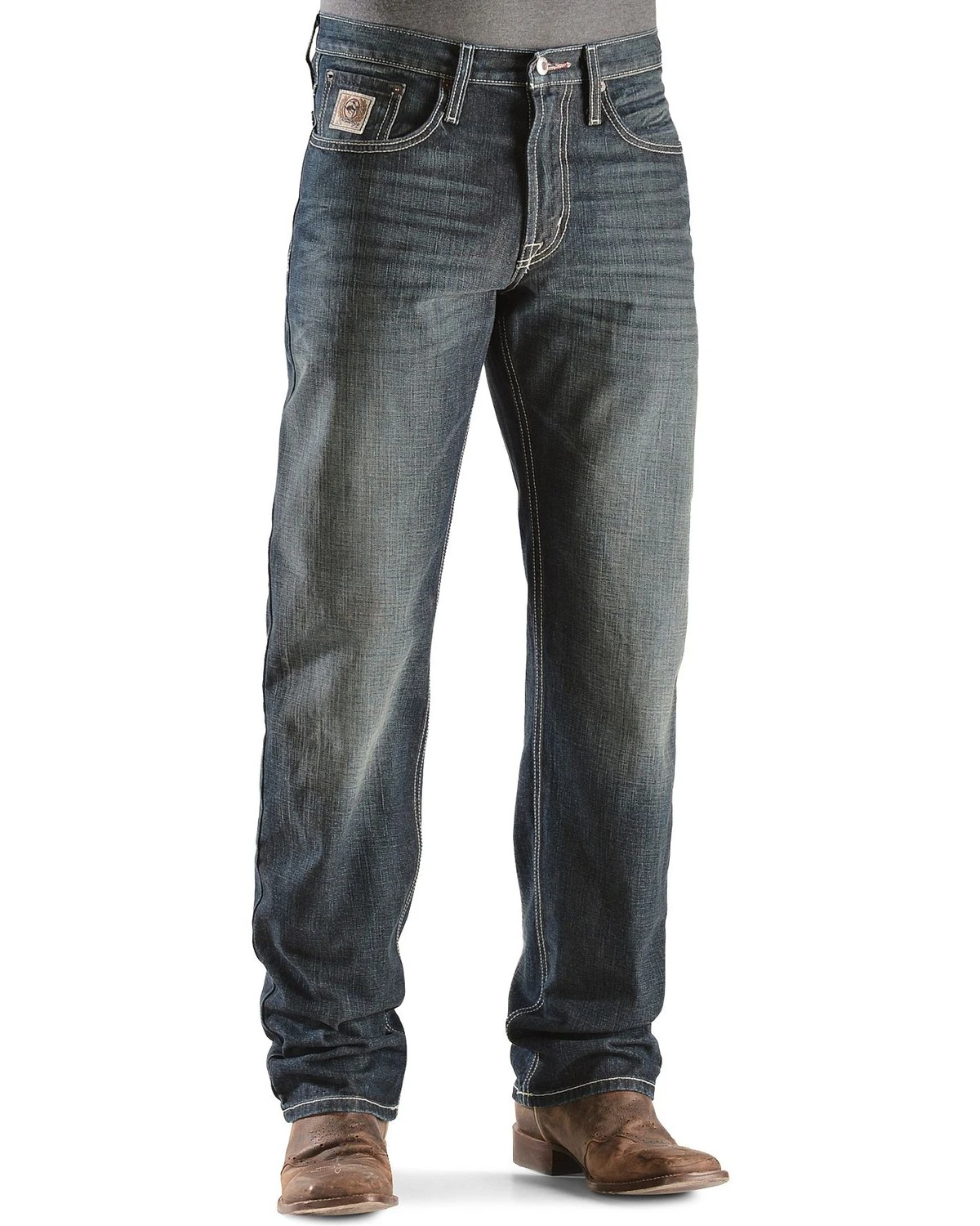 - Dark Stonewash with whiskers, hand sanding, and slight tint